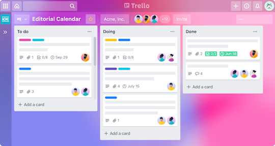 Use Trello as a whiteboard to generate ideas, a workspace to coordinate with contributors and editors, or a calendar to manage what’s due and when. To get started, simply create a board and add some ideas. Lay out the details with descriptions or attachments.