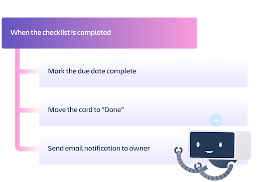 Trello automates the time-consuming task of “managing work,” so you can focus on the important things. Tell Trello the action you’d like to take once a trigger (like a due date) has occurred, and let it handle the rest (like sending you an email reminder). It’s like having a personal assistant that can read your mind.